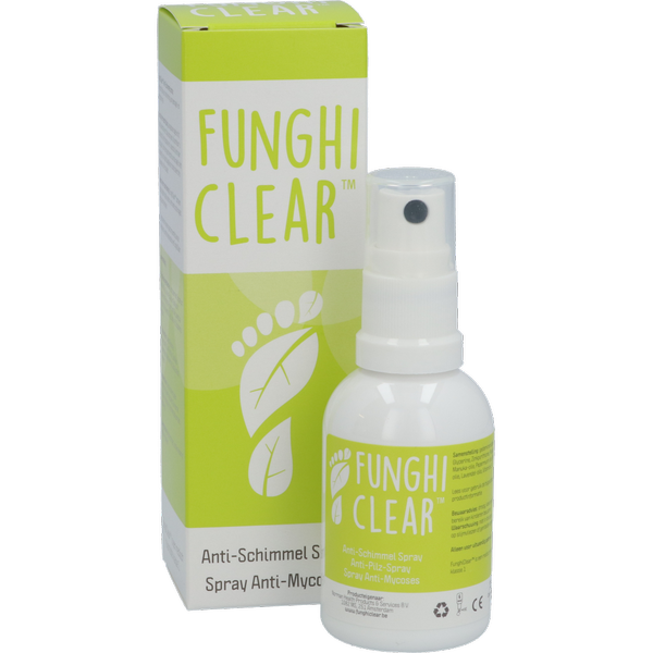 FunghiClear™ is een antischimmelspray met unieke eigenschappen en bewezen resultaten* op gebied van schimmelwering en schimmelremming. FunghiClear™ werd met de grootst mogelijke zorg samengesteld met uitsluitend natuurlijke ingrediënten als actieve stoffen, waaronder manukaolie. De spray helpt om de huid in goede conditie te brengen. Het product bestrijdt bestaande overlast en voorkomt nieuwe (her)infecties van de voeten en nagels. Voor dagelijks thuisgebruik.