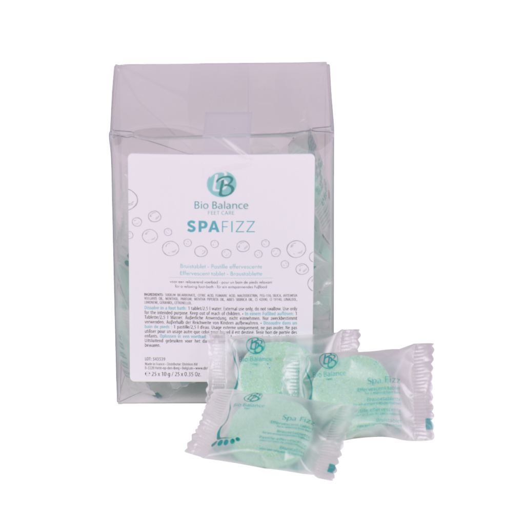 Bruistabletten (Groenkleurige bruistabletten verrijkt met munt, salie, pijnboompit en essentiële oliën) die de bloedsomloop in de voeten stimuleren en een uitzonderlijk relaxerend en verfrissend effect hebben.